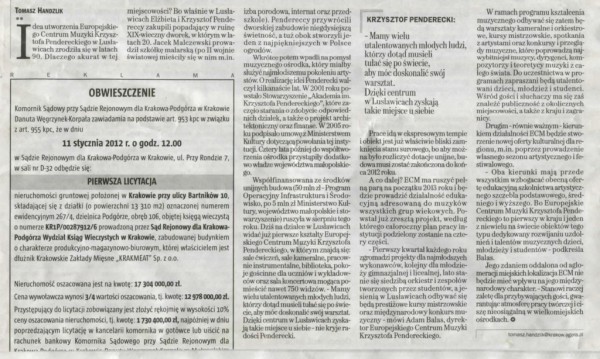 Kilka miesięcy temu na dzialce w Luslawicach rosła tyIko trawa, dziś widać już pierwsze zarysy Europejskiego Centrum Muzyki Krzysztofa Pendereckiego. Za rok pod okiem najwybitniejszych znawców muzyki ksztatcić się tam będą dzieci oraz młodzi artyści z kraju i zagranicy...