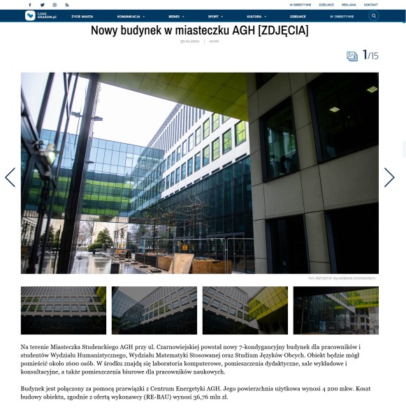 W portalu lovekrakow.pl ukazał się artykuł odnośnie kończącej się budowy budynku C7 na terenie Miasteczka Studenckiego AGH. Link do artykułu znajduje się tutaj