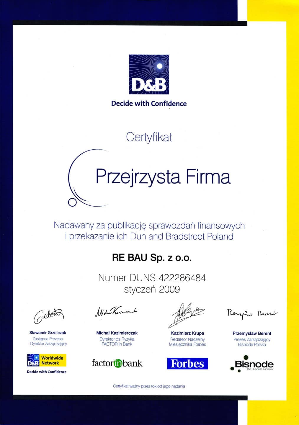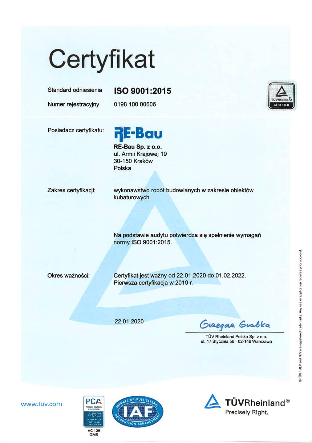 In 2007 RE-Bau implemented the Quality Management System in ISO 9001 standards which in 2015 was updated to ISO 9001:2015. The effectiveness of our QMS is certified each year by TÜV Rheinland auditors.